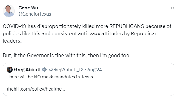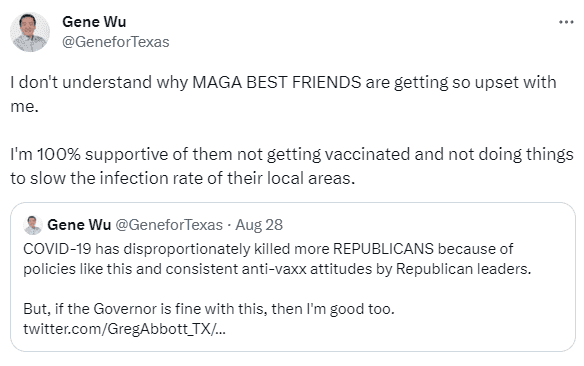 Not satisfied with making blanket deathwish statements, he directed his ire toward a Texan from Ector County, pointing at that area’s COVID death rate. It’s worth noting that Ector County’s population is 44.3% “fully vaccinated” (4% boosted) while Wu’s Harris County is over 65% fully jabbed (11% boosted). Current weekly COVID admissions per 100,000 residents in Harris County is over twice that of Ector’s. Follow the science, Wu.