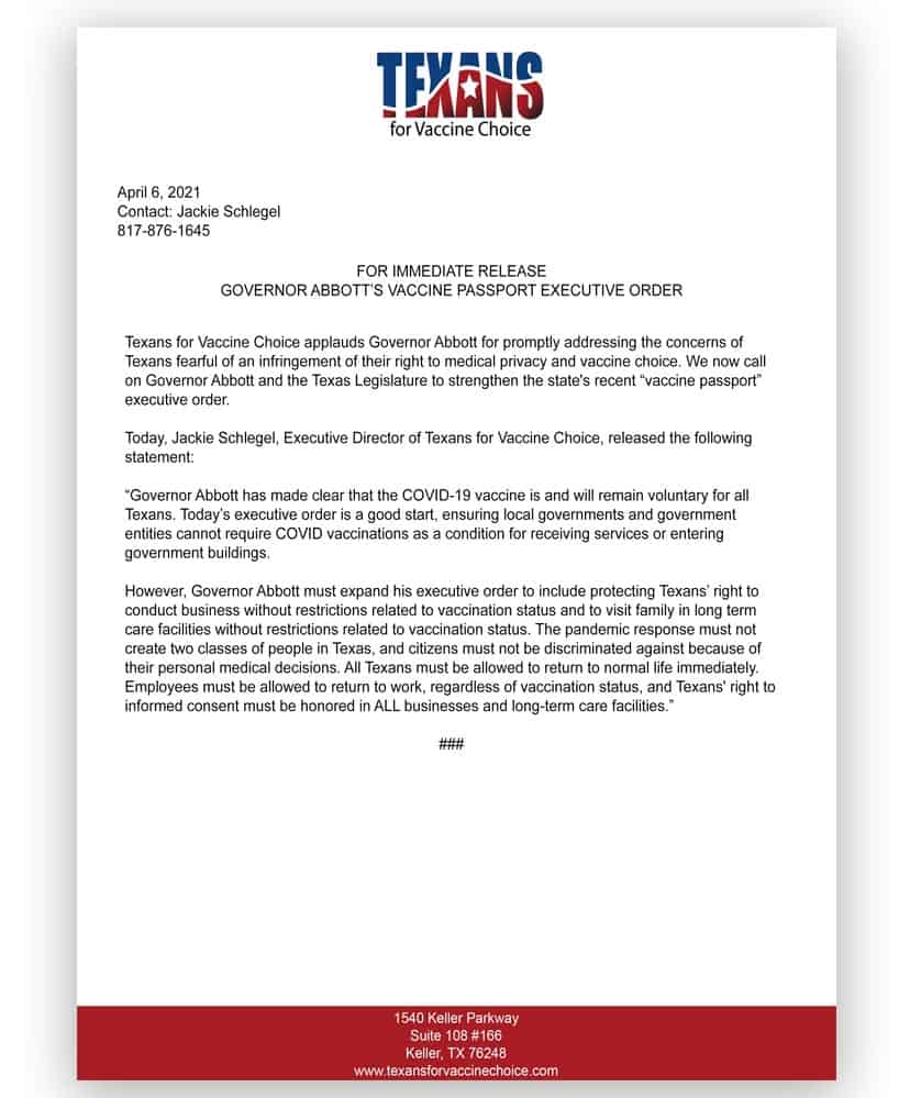Texans for Vaccine Choice applauds Governor Abbott for promptly addressing the concerns of Texans fearful of an infringement of their right to medical privacy and vaccine choice. We now call on Governor Abbott and the Texas Legislature to strengthen the state’s recent “vaccine passport” executive order.