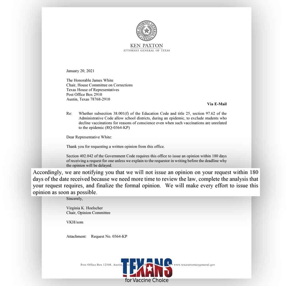 To stop this attack on parental rights before it started, TFVC contacted Texas House Chairman James White, who promptly asked Texas Attorney General Ken Paxton to issue an Attorney General’s Opinion. By issuing an opinion, AG Paxton would close the door on some school districts enforcing a de-facto vaccine mandate on Texas children.