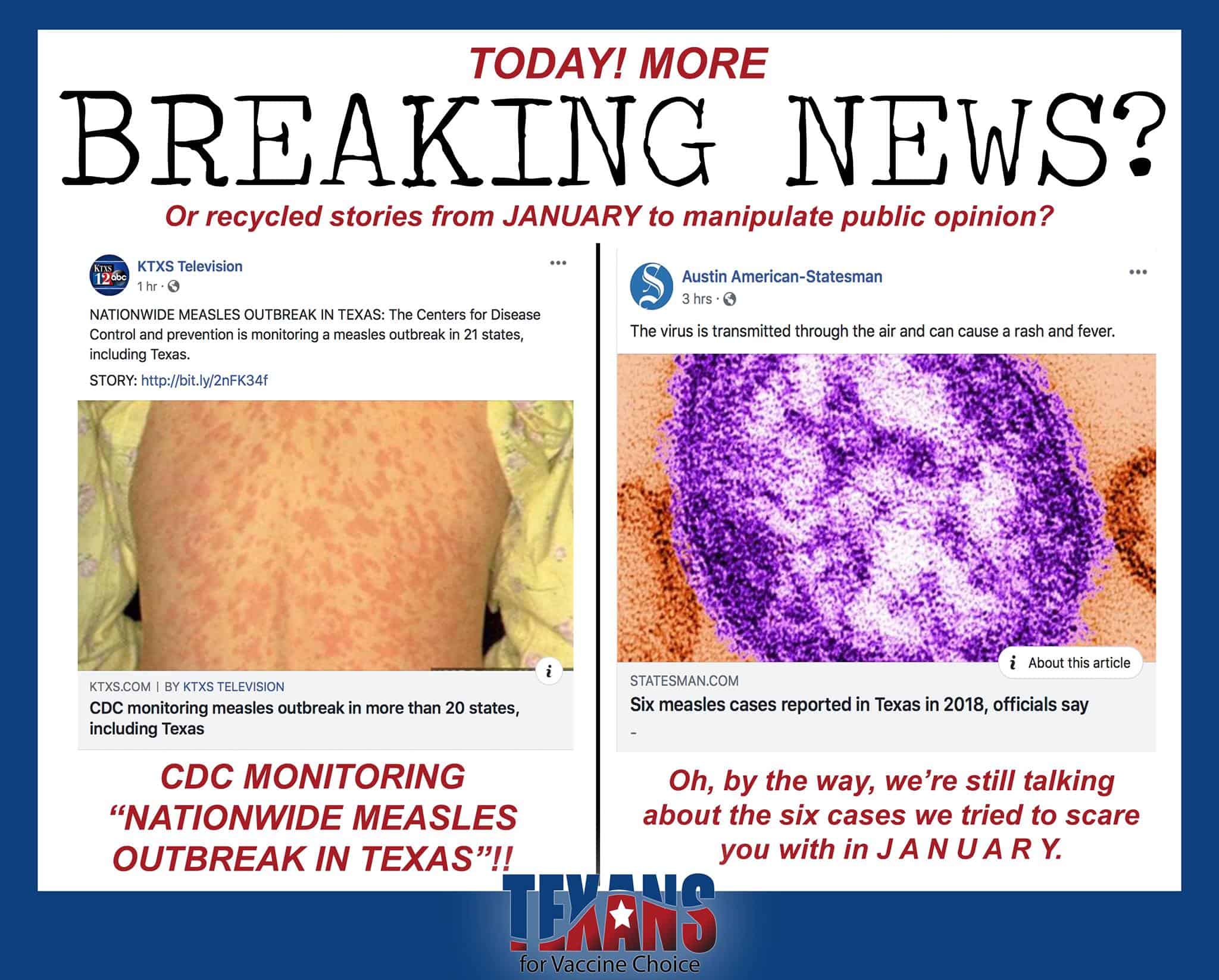 ☠️ Did you hear?? KTXS Television in Abilene wants you all to know that the CDC is monitoring a “NATIONWIDE” (???) MEASLES OUTBREAK RIGHT HERE IN TEXAS!! Be afraid! Be so afraid that you grab the pitchforks and torches, fight with the other parents in your community, and willingly hand over your medical freedom to the state RIGHT NOW TO SAVE US ALL!