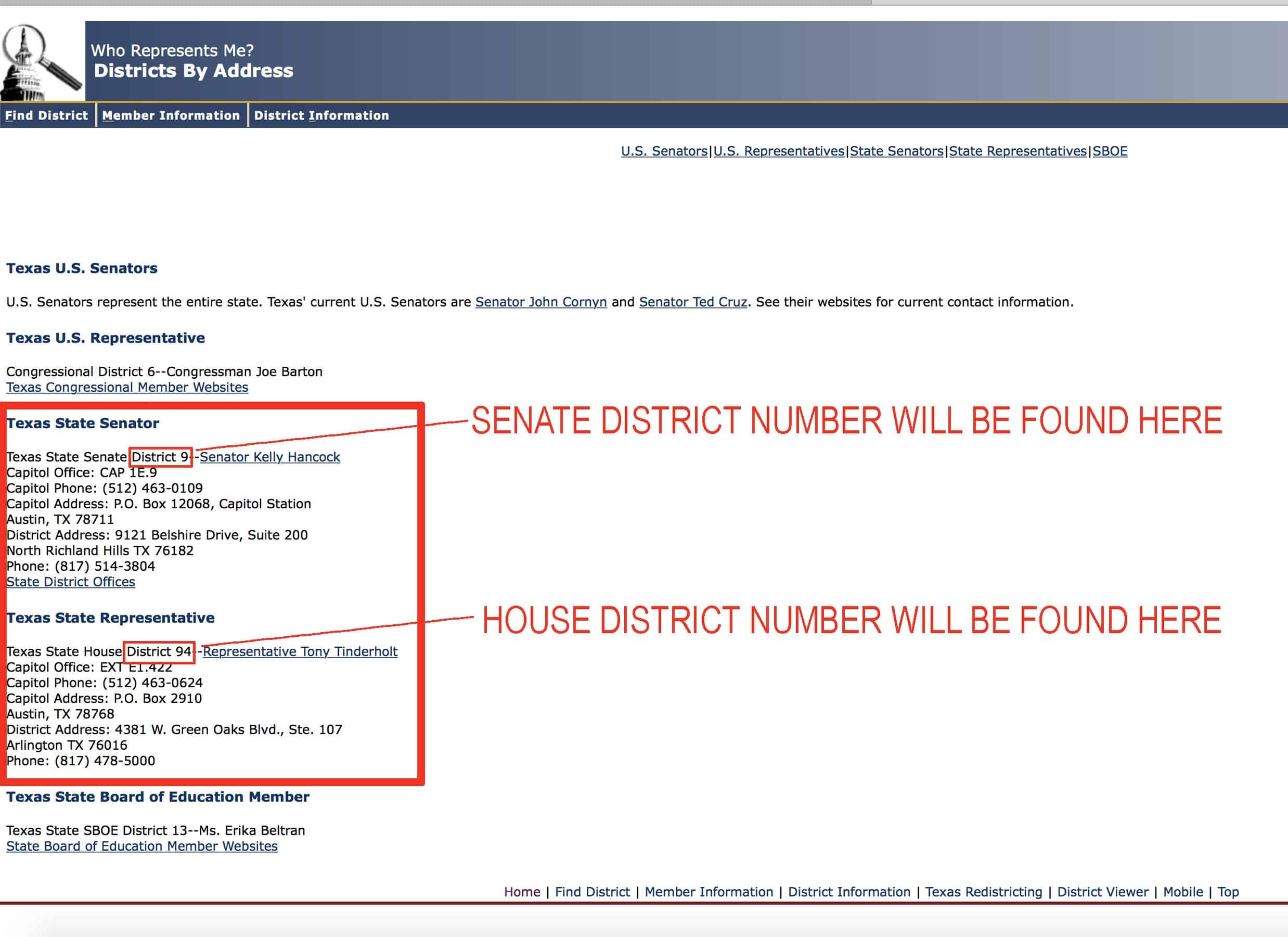 Visit www.fyi.legis.state.tx.us and enter your address. You will find your state senator and your Senate District under “Texas State Senator” and your state representative and your House District number under “Texas State Representative”. Use these Senate District and House District numbers to find the TFVC-endorsed candidate in the list here.