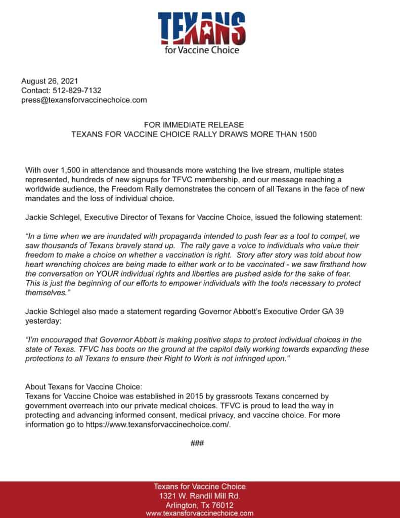 “In a time when we are inundated with propaganda intended to push fear as a tool to compel, we saw thousands of Texans bravely stand up. The rally gave a voice to individuals who value their freedom to make a choice on whether a vaccination is right. Story after story was told about how heart wrenching choices are being made to either work or to be vaccinated – we saw firsthand how the conversation on YOUR individual rights and liberties are pushed aside for the sake of fear. This is just the beginning of our efforts to empower individuals with the tools necessary to protect themselves.”