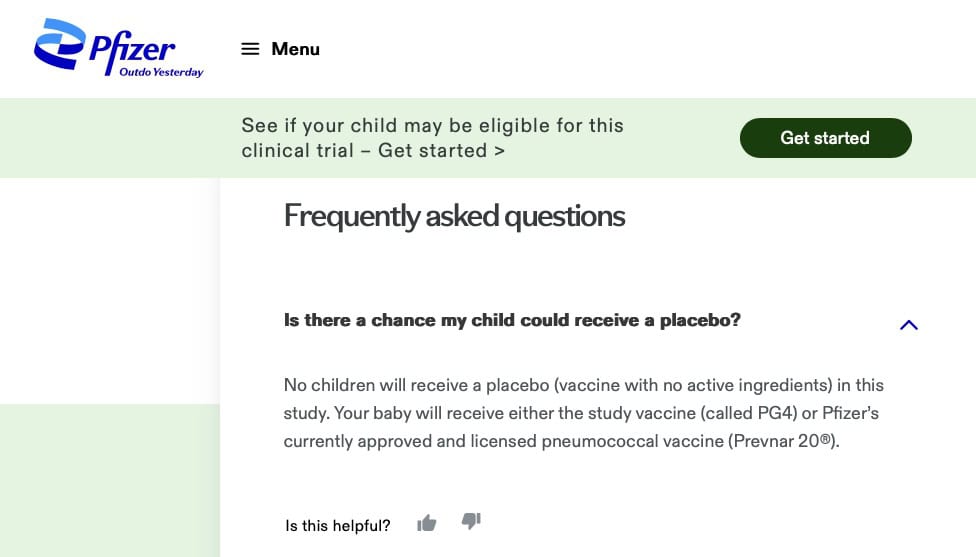 Pfizer seeking babies as young as six weeks old as participants in a clinical trial for a new vaccine. The ads state that these trials will use no placebo – the babies will receive either the test vaccine or an already licensed vaccine.