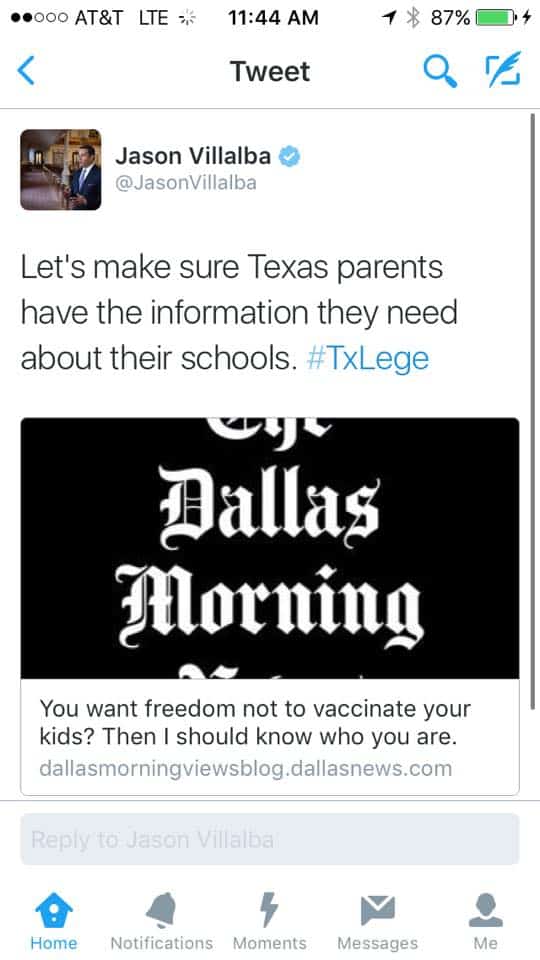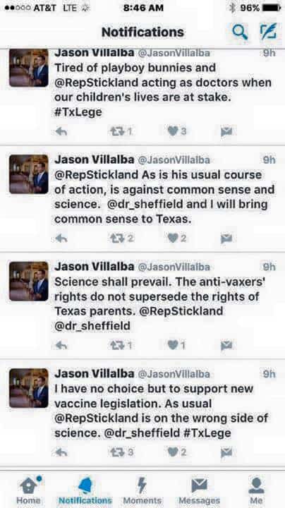 Jason Villalba was letting us know that he plans to remove your medical privacy. Have you read “Parents’ Right to What?” He even retweeted an article calling us “crackpots” whining that he had “really tried” (to violate our rights). Funny that an attorney keeps forgetting that laws are already in place to protect the innocent.