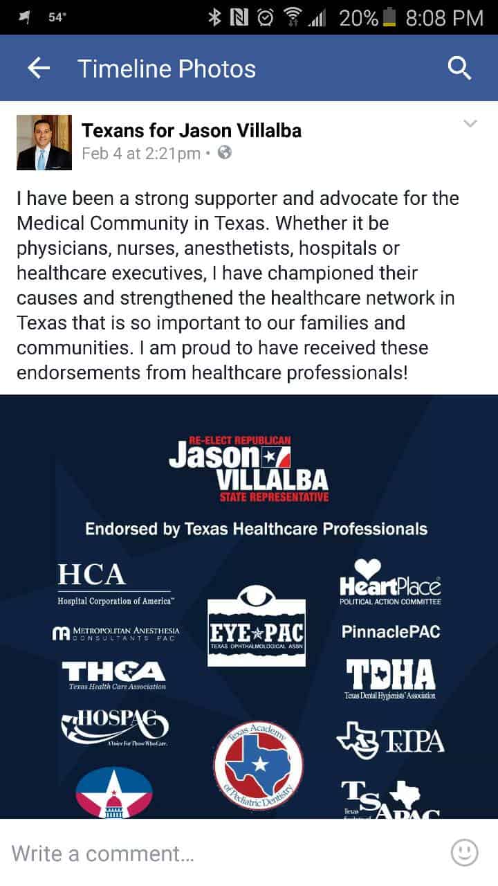 In 2015, Jason Villalba filed multiple bills that were gross violations of our Constitutional rights and civil liberties. He is listed as a “Pro-Life Fraud” by Texas’ top pro-life organization though he claims to be a champion to the unborn. He tried to pass a bill making it illegal to record conversations with legislators! Of ALL things!